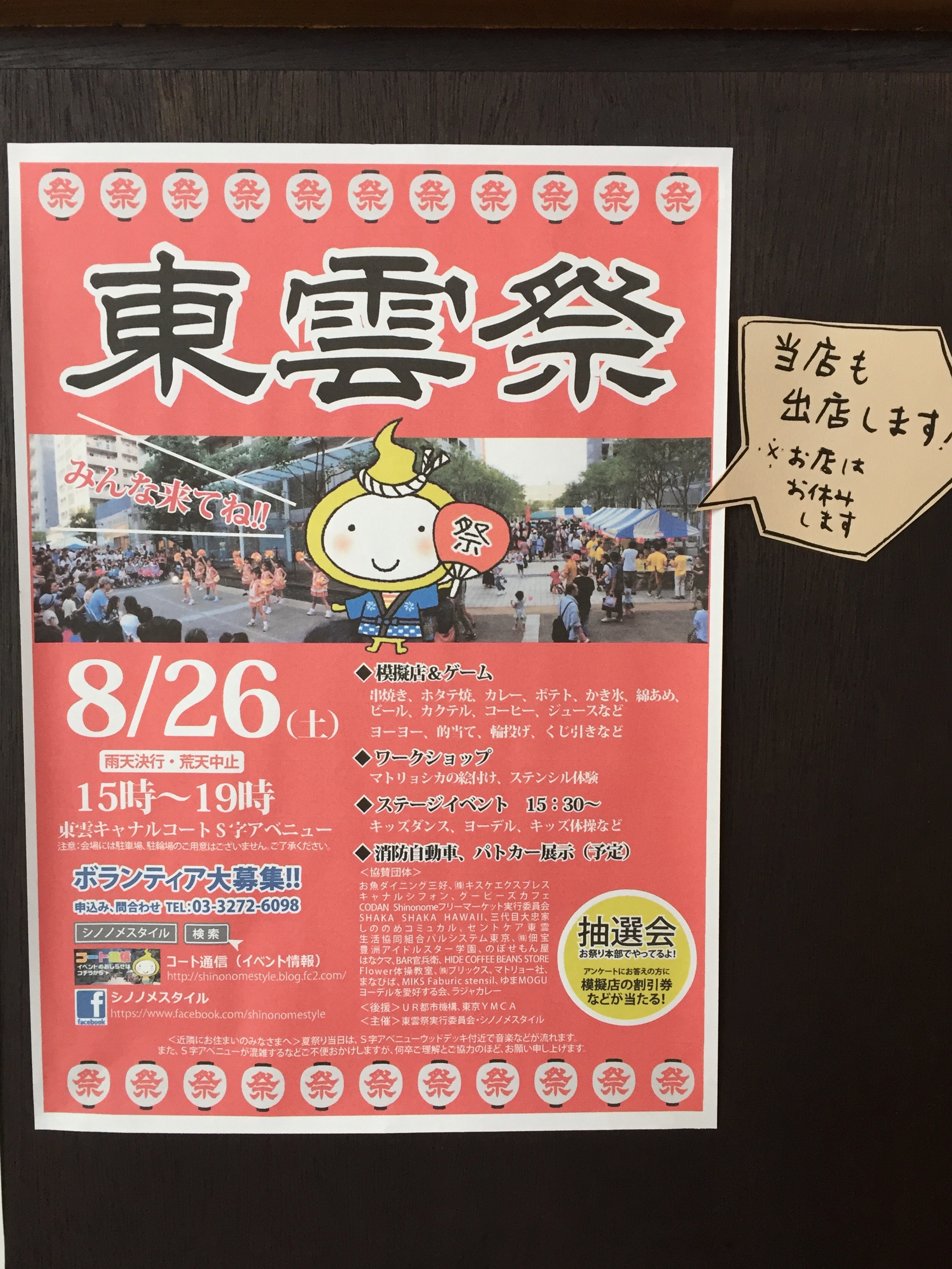 8月26日(土)は近所で開催される『東雲祭』に出店の為、